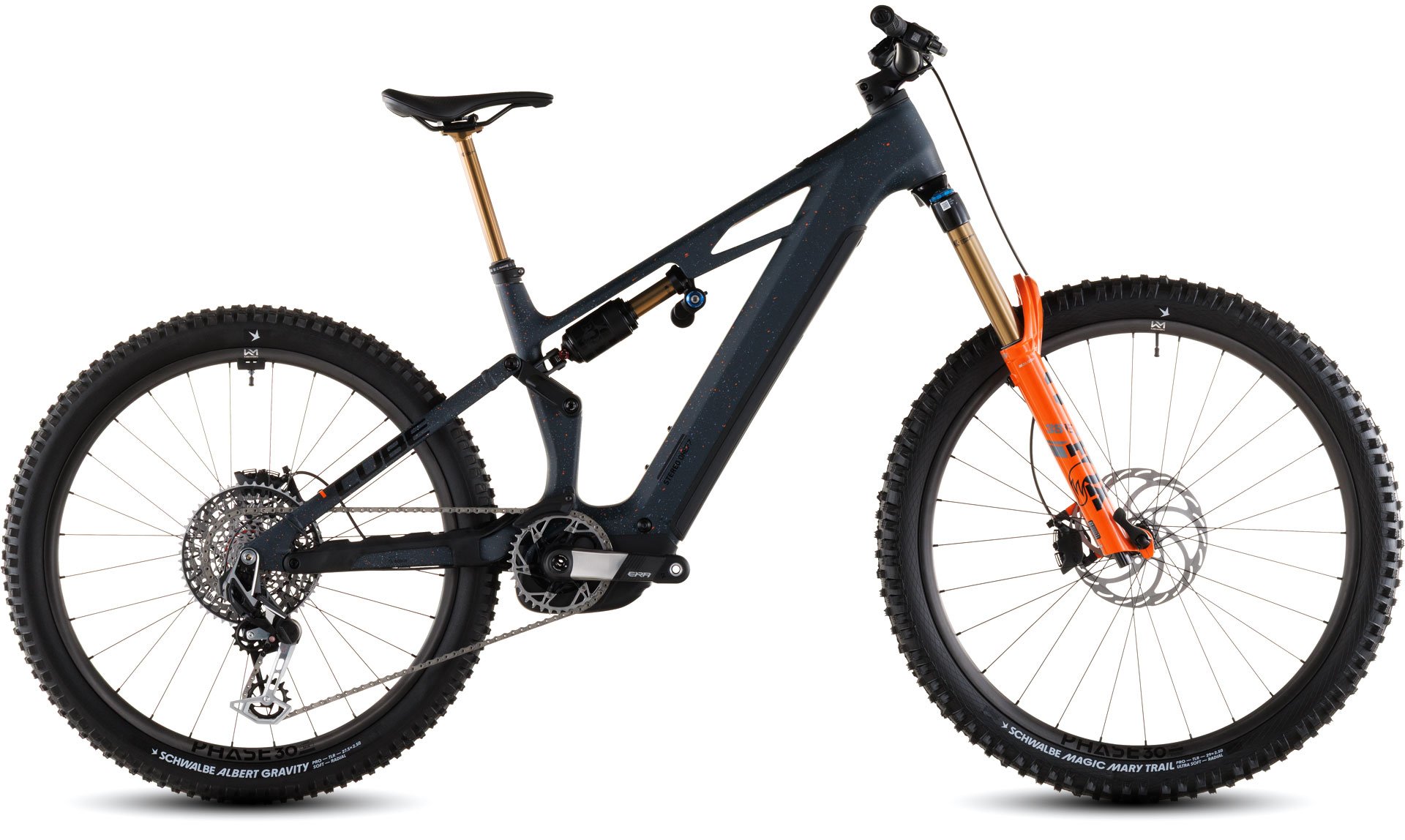 The Stereo Hybrid ONE77 HPC frame – with 170mm travel front and rear and a mullet wheel setup with 29in front and 27.5in rear – is all you need for big days out on big mountain trails. But, as with all CUBE designs, the devil is in the detail. So, for example, we added Integrated Cable Routing for super-clean looks, and then threw in an angle-adjustable headset so that you can tweak the handling to your taste. The 800Wh PowerTube battery sits unobtrusively in the carbon down tube, just above the Bosch CX drive. A UDH dropout on the aluminium rear triangle is tough and future-proof, and we also added a Direct Mount chain guide to keep you driving forwards even when the going gets rough.